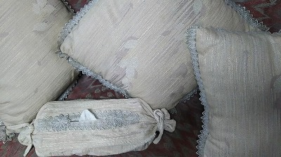 丸いクッションと四角いファブリックは水色カーテンの残り布で。
