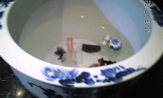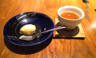 前菜 海老と蟹のフカヒレスープの煮凝り、煮物、スープ。