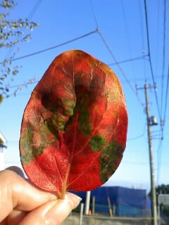 柿の葉の、赤とミドリと茶の混ざり具合が