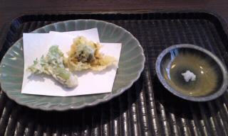 蕗の薹とタラの芽の天ぷら。レモン塩で。