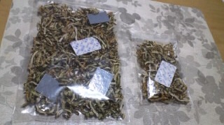天日で干したあと、フライパンで茶色くなるまで乾煎りすると、