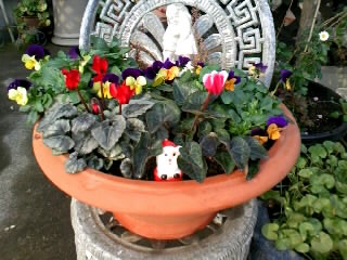 陶器のエンジェルさんには、庭の南天の実と松ボックリを。