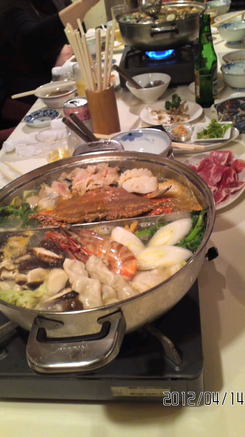 1つのお鍋の中が半分に仕切られていて、片方が辛い味付け(蟹が入っている方)で、そのままいただく。